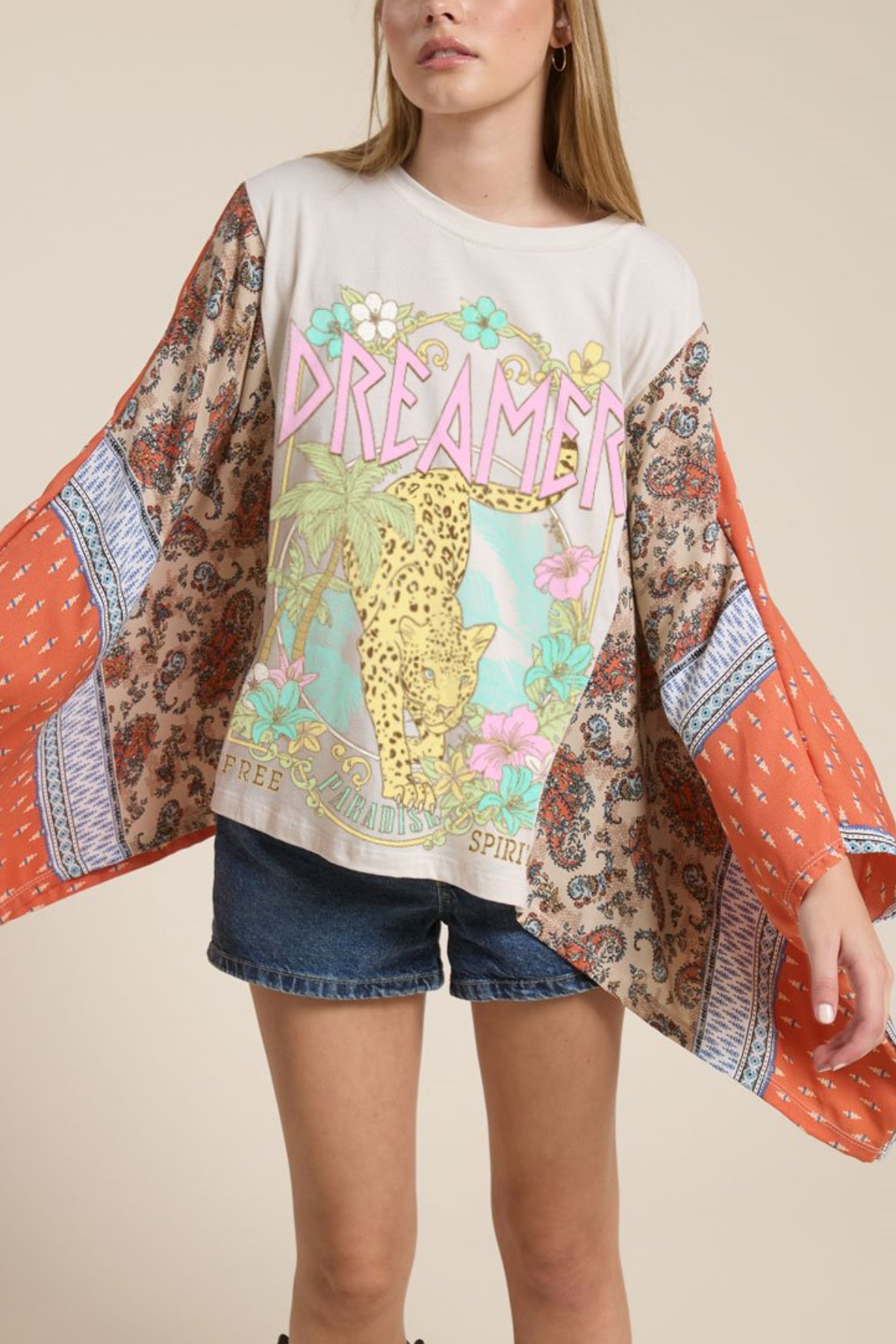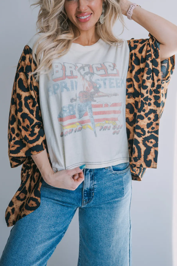 Dreamer Leopard Paradise Graphic Sheer Sleeves Kaftan Top