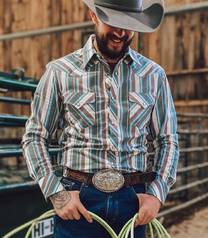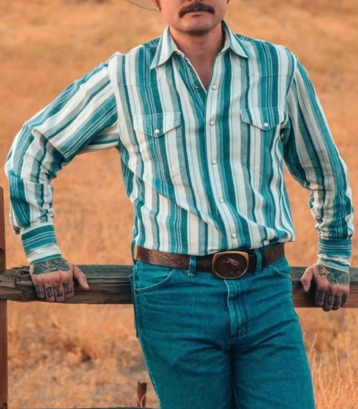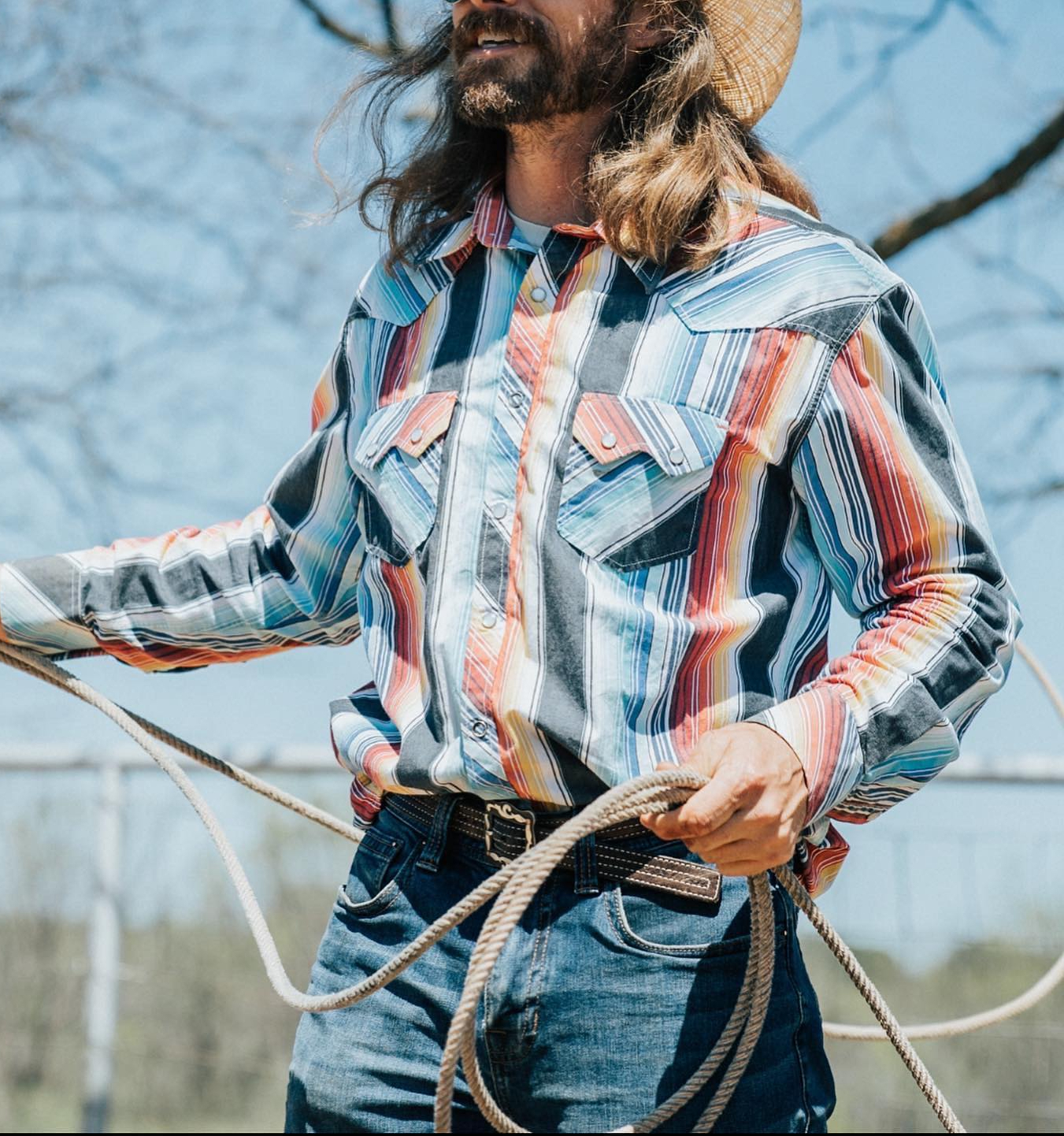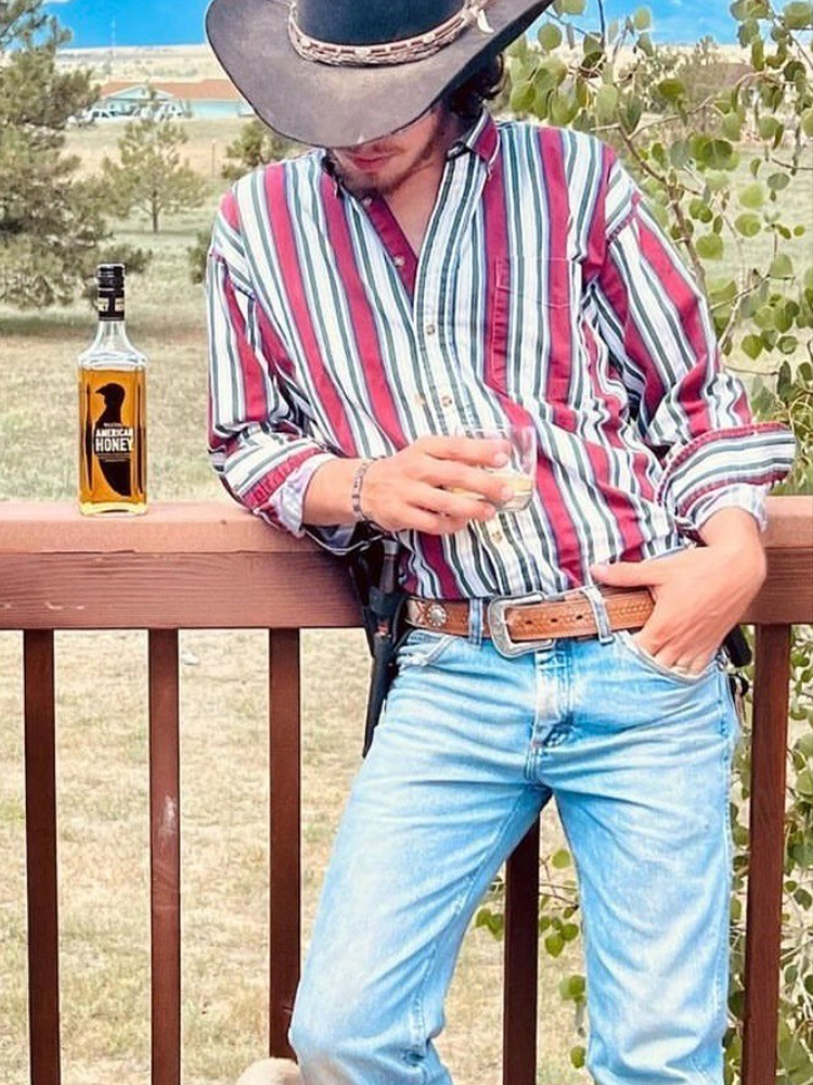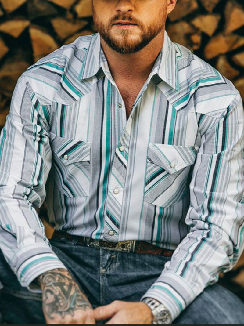 Men's Striped Print Retro Western Fashion Casual Lapel Long Sleeve Shirt