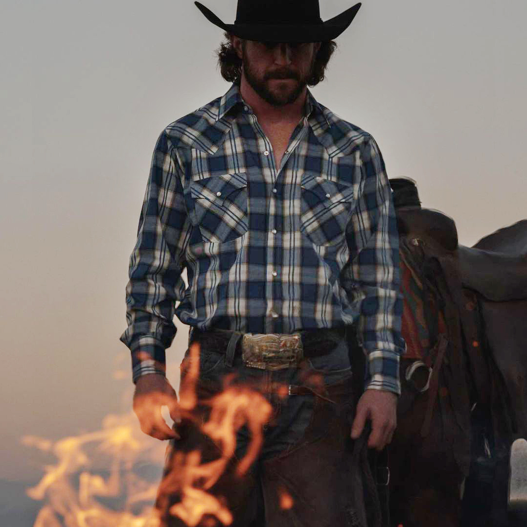Men's Retro Western Blue Plaid Casual Long Sleeve Shirt