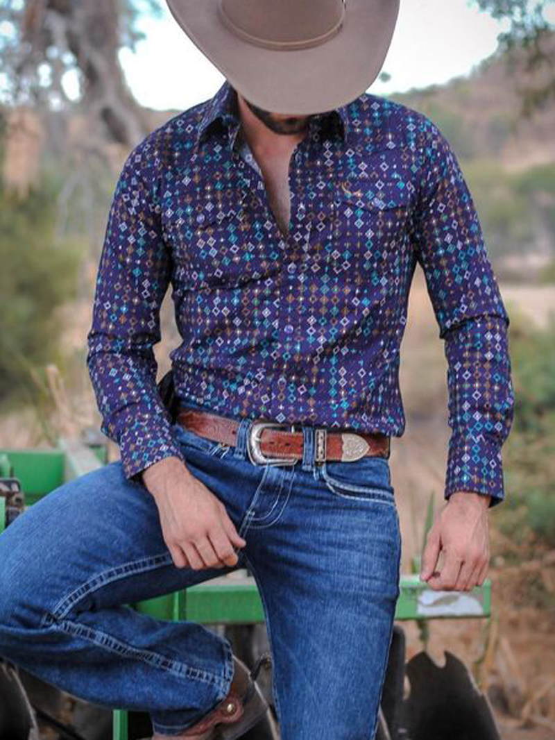 Men's Casual Vintage Western Print Long Sleeve Lapel Shirt