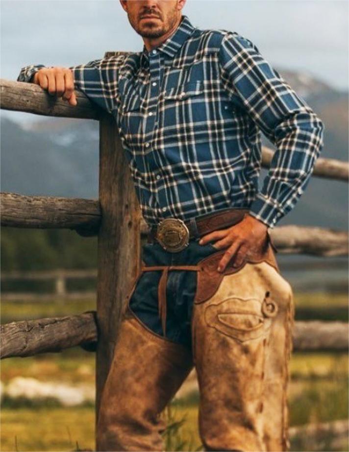 Men's Casual Vintage Western Plaid Print Long Sleeve Lapel Shirt