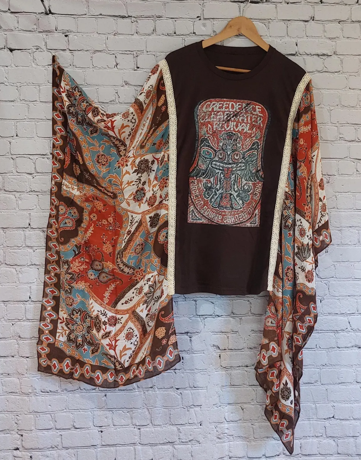 DetailsOne of a kind!Washed Vintage Graphic Tee with Batwing SleeveColor: PictureMaterial: 50% Cotton50% Recycled Mixed Fabric