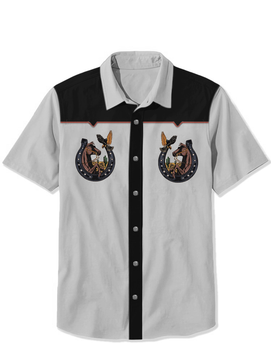 Summer Casual Horseshoes & Horse Print Short Sleeve Shirt
