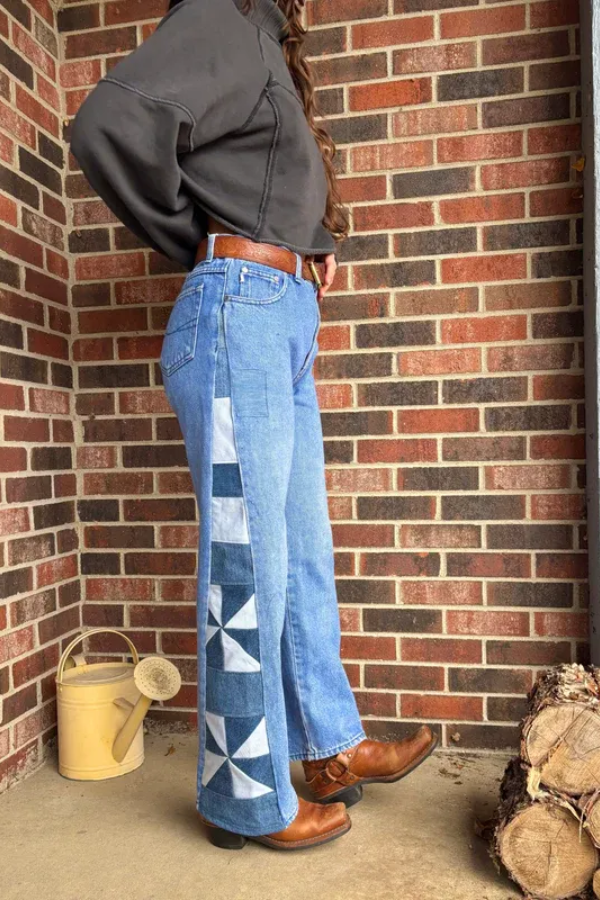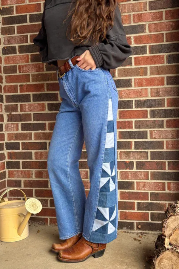 The outer seams of the pant legs feature a multicolored denim patchwork design, blending varying shades of denim blue with geometric blocks and classic eight-pointed star/pinwheel quilting motifs. This design faithfully recreates the handcrafted aesthetic of vintage American patchwork quilts; consequently, every pair is a unique, bespoke piece—ensuring you will never encounter an identical match. The patchwork extends from the waist and hips down to the hem, incorporating denim fabrics with varying wash intensities to create rich visual depth and an intensely vintage vibe. The high-waisted cut elevates the waistline to optimize body proportions and elongate the legs. Furthermore, the dramatic flared silhouette—which flares out naturally from the knee—perfectly flatters the leg shape; it is exceptionally forgiving for those with O-shaped legs, thicker calves, or a pear-shaped figure, offering superb coverage and a slimming effect.