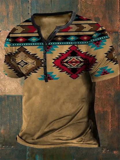 Men's Casual Button Neck Print Short Sleeve T-Shirt