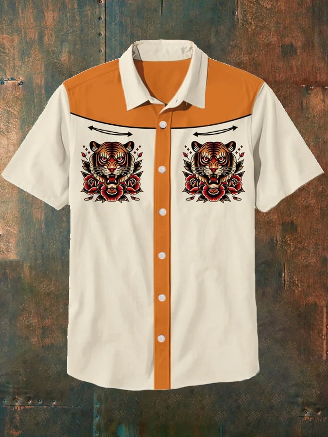 Men's Retro Ukiyoe Tiger Tattoo Print Casual Shirt