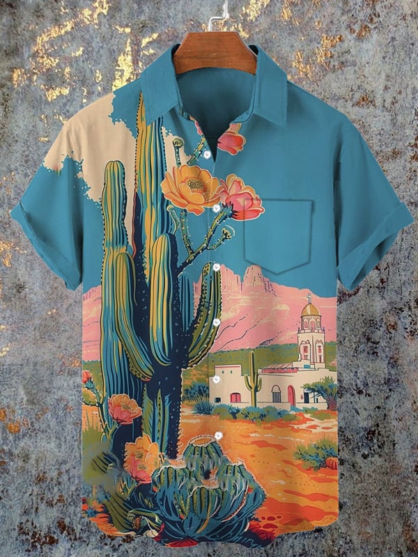Men's Retro Western Totem Print Pocket Short Sleeve Shirt
