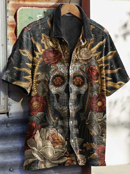 Men's Vintage Western Skull Floral Print Waffle Shirt