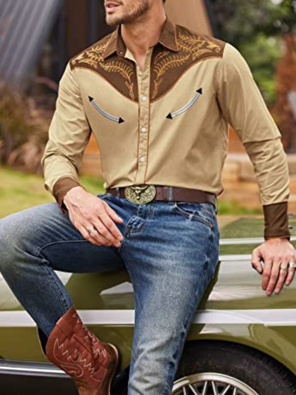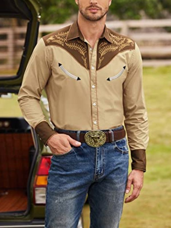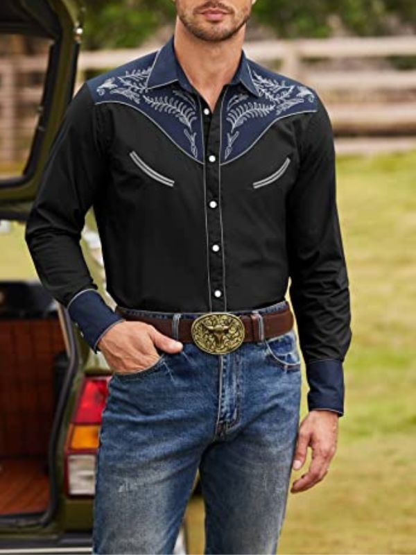 Men's Western Cowboy Embroidered Long Sleeve Button Down Shirt