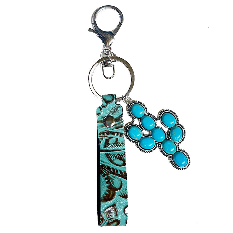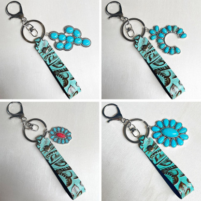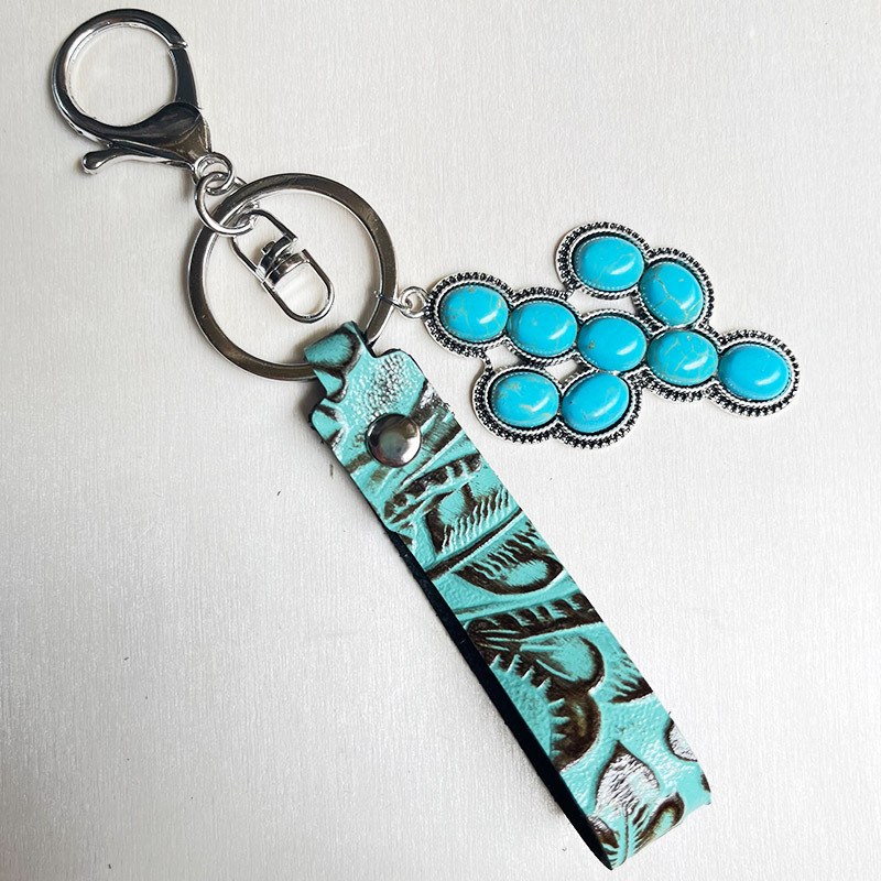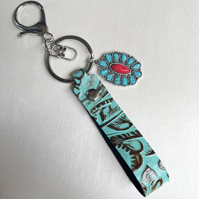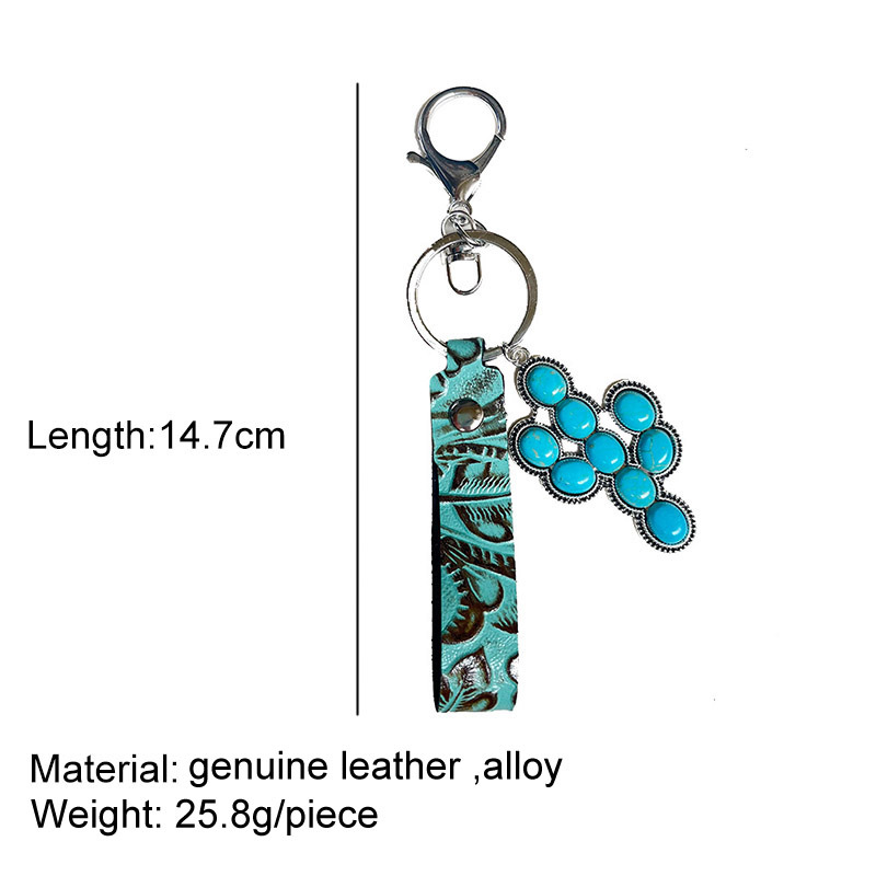 Genuine leather keychain retro ethnic style turquoise cactus western style