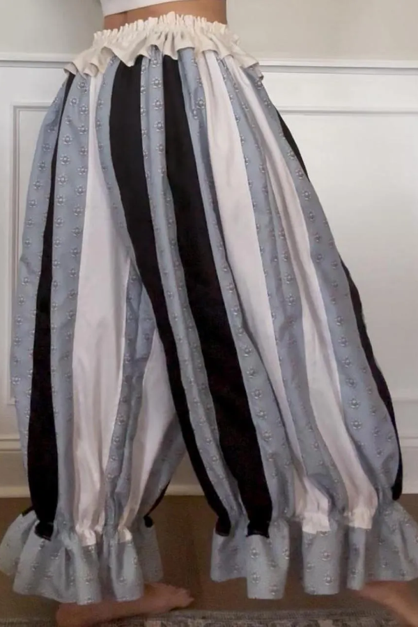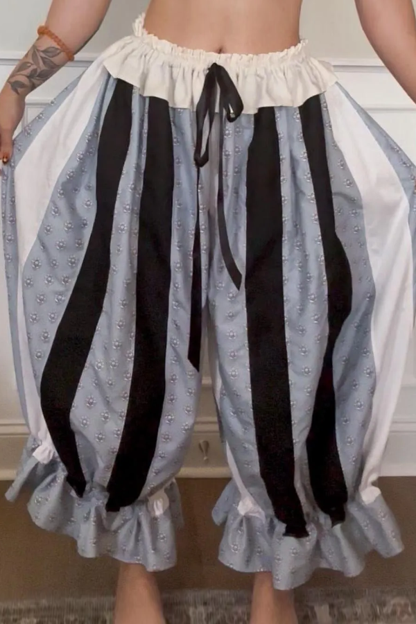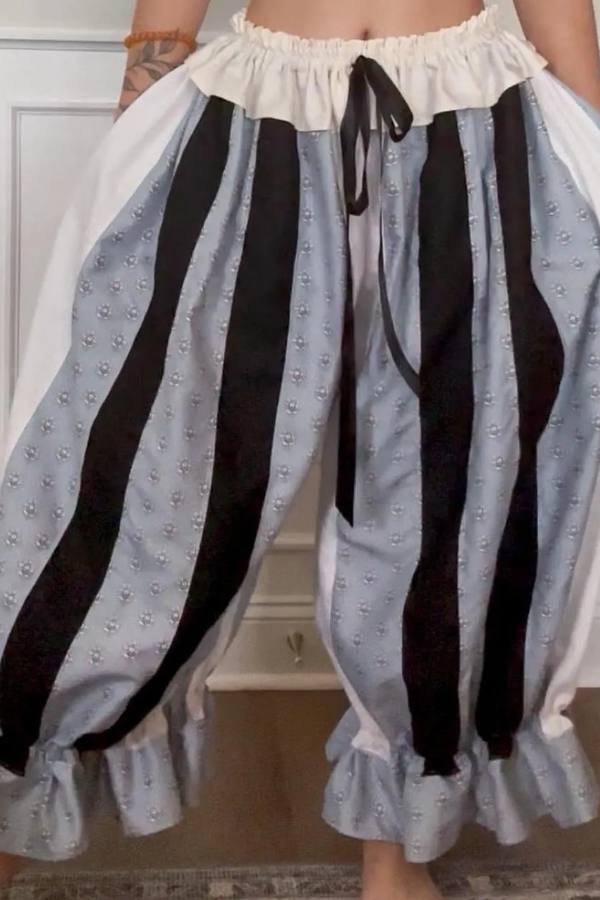 These trousers are made from long, two-tone panels. The waistband is easily adjustable with a drawstring. Button-down openings provide extra comfort. Side pockets add functionality. The trousers are floor-length with lace ties at the ankles for a more fitted look.
