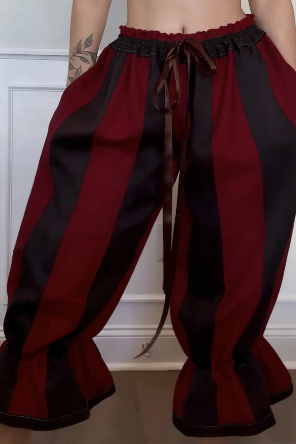 These trousers are made from long, two-tone panels. The waistband is easily adjustable with a drawstring. Button-down openings provide extra comfort. Side pockets add functionality. The trousers are floor-length with lace ties at the ankles for a more fitted look.